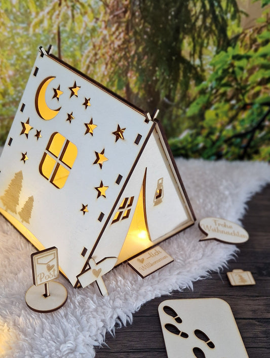 Wichteltür Zelt aus Holz mit Dekorationen, ideal als Wichtelhäuschen für Weihnachten
