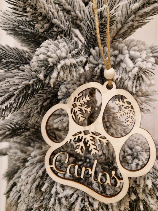Hundepfote aus Holz mit individuellem Namen – Weihnachtlicher Baumschmuck