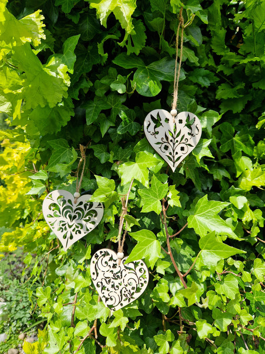 Holzherzen mit Musterausschnitt zum Aufhängen im Freien und Innenbereich, 3er Set Dekoration vintage Herzen aus Holz
