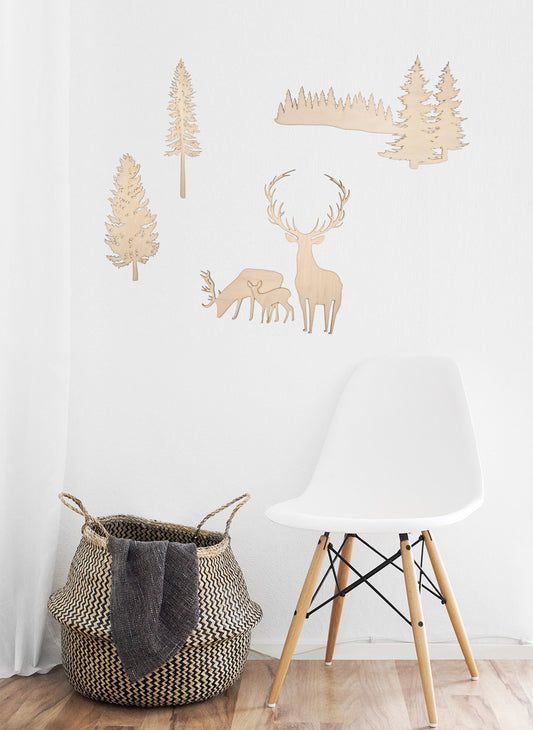 Wanddekoration - Hirsch, Rehe, Bäume Natur Set. Ideal für Wohnzimmer, Esszimmer, Schlafzimmer